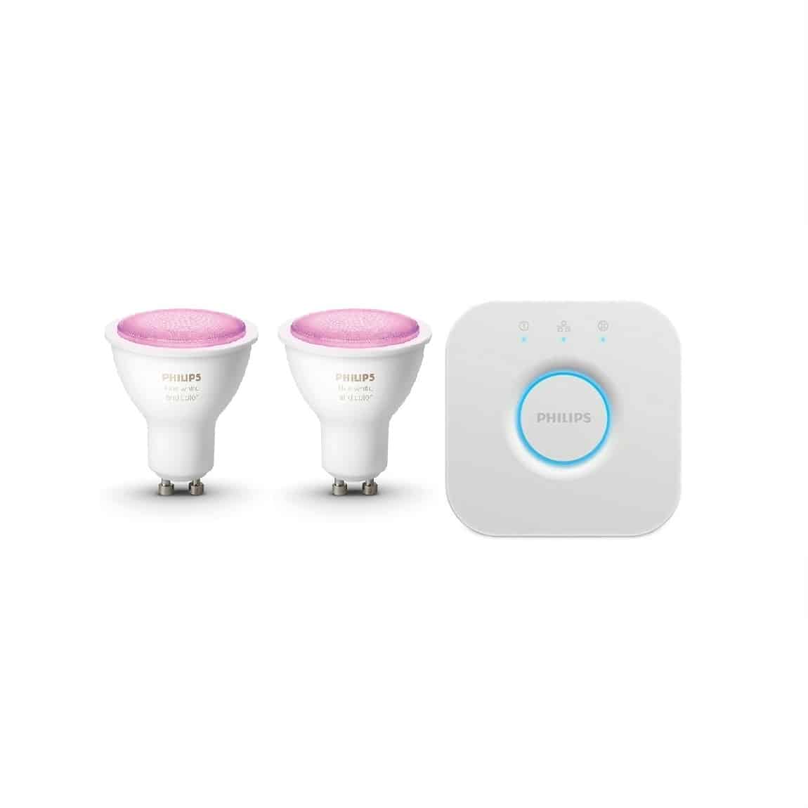 - Zwei Philips Hue GU10 Color Lampen: Diese Lampen bieten dir die gesamte Farbpalette von Weiß bis hin zu 16 Millionen Farben. Steuere sie individuell oder in Gruppen, um die perfekte Atmosphäre für jeden Anlass zu schaffen.