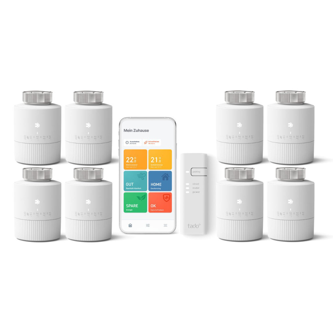 Dieses Starter Kit ist ideal für größere Wohnungen und Häuser mit mehreren Heizkörpern. Die acht mitgelieferten Thermostate lassen sich einfach anstelle deiner alten Ventile installieren und verwandeln deine Heizkörper in intelligente Wärmequellen. Die tado° Bridge verbindet die Thermostate mit dem Internet und ermöglicht die Steuerung über die App.